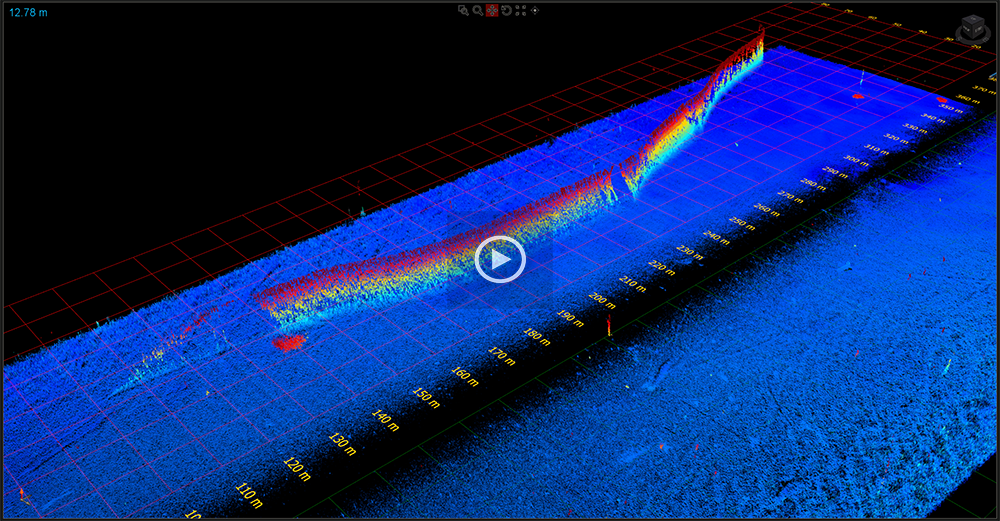 This animation shows a gillnet and schools of fish colourized by both intensity and depth. The net has an opening near the centre, and the anchor line at the near end and along the bottom of the net is also evident in the backscatter intensity. The schools of fish are weak water-column targets that do not cast shadows and are therefore not easily visible with 2D Side Scan, but are immediately apparent in 3D Side Scan.